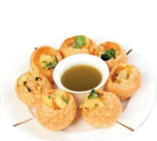 Crispy puris filled with a mix of spicy, tangy, and sweet tamarind water, potatoes, chickpeas, and fresh mint and coriander chutney.