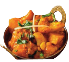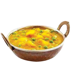 A classic vegetarian dish featuring tender potatoes and green peas in a spiced tomato gravy, served with steamed rice.
