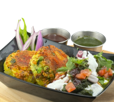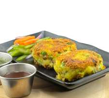Irresistible potato patties are spiced with aromatic herbs and cooked to golden perfection, served with refreshing mint chutney and sweet tamarind chutney.