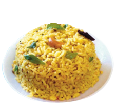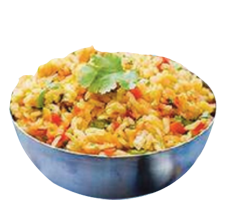 A vibrant South Indian dish featuring fluffy rice mixed with zesty lemon, rich coconut, crunchy nuts, and fragrant curry leaves. Each bite delivers a citrusy-coconut explosion, topped with roasted peanuts (can be made without peanuts upon request).