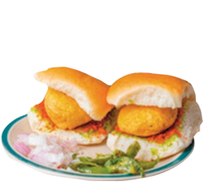 Potato fritters, called "vada," are made with mashed boiled potatoes and spices, served in a soft bread roll known as "pav.